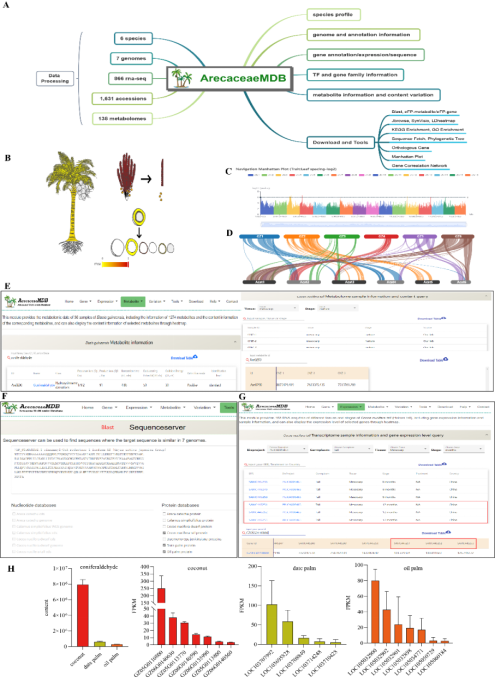 目前,油棕、椰枣、椰子等棕榈科植物基因组被相继破译,并随之产生了大量的组学数据,但该领域的研究还没有整合的生物信息学数据库。罗杰团队联合合作单位在2021年发布了两个高质量椰子基因组,在此基础上,团队对油棕、椰枣、椰子、槟榔、省藤和黄藤六个物种的七个基因组数据、1,631个变异组数据,866个转录组数据及138个代谢组数据进行整合分析,并嵌入了12个常用的生物信息学分析工具,构建了棕榈科首个多组学综合分析平台ArecaceaeMDB (//arecaceae-gdb.com)。