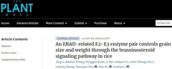 2022年12月15日,Plant Cell在线发表了中国科学院遗传与发育生物学研究所李云海团队完成的题为“An ERAD-related E2-E3 enzyme pair controls grain size and weight through the brassinosteroid signaling pathway in rice“的研究论文,入驻成人网
