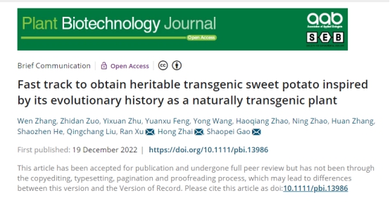 三亚南繁研究院的徐冉教授与中国农业大学甘薯研究室合作在Plant Biotechnology Journal上发表了题为Fast track to obtain heritable transgenic sweet potato inspired by its evolutionary history as a naturally transgenic plant的论文。受天然转基因作物甘薯启发,该研究揭示了天然转基因植物的广泛存在暗示植物遗传转化的“快车道”。
