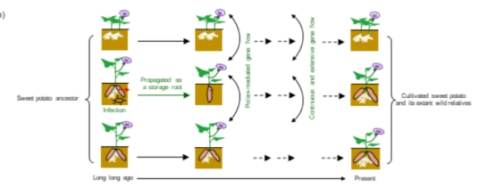 此外,本研究提出了一种甘薯演化的进程假说:即在过去的某个时间点上,发根农杆菌(或其他祖先种)感染甘薯祖先种导致了一个具有有趣特征的无性系(储藏根)——也许是一个紧凑的植物株型或/和更好的适应性,由人类选择并进行无性繁殖。在漫长的栽培、驯化、扩散和多样化过程中,许多甘薯及野生近缘种可能通过杂交参与了农杆菌T-DNA扩散。这也解释了为什么基因组整合的IbT-DNA不仅局限于栽培甘薯,也存在于相关近缘物种中。