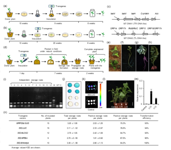 之前,来自比利时根特大学、国际马铃薯中心和中国农业大学的一项合作研究显示,甘薯是一种天然的转基因植物(PNAS, 2015, 112: 5844-5849)。农杆菌是一种天然的植物病原菌,可以通过植物的创伤部位侵染植物,然后将自身的“T-DNA”转入并整合到植物的基因组中。甘薯含有两种农杆菌转移DNA,称为IbT-DNA1和IbT-DNA2。这两段T-DNA与发根农杆菌有很高的同源性。众所周知,发根农杆菌含有两个可转移的T-DNA区域:TR-DNA和TL-DNA。TR-DNA对应于甘薯IbT-DNA1 (包含生长素生物合成基因iaaH和iaaM),TL-DNA (包含各种Rol基因) 对应于甘薯IbT-DNA2。基因表达量检测显示至少有4个IbT-DNA1上的基因和2个IbT-DNA2上的基因表达,暗示IbT-DNA1和IbT-DNA2在甘薯进化中发挥作用。甘薯中的IbT-DNA的存在暗示在其祖先驯化历史上被农杆菌侵染后产生的毛状根作为一种不定根,有发展为具有繁殖能力的块根以实现稳定遗传的潜力。这一假设得到了本研究的支持——通过发根农杆菌侵染受伤的茎段后种植田间可以实现快速、高效的遗传转化。
