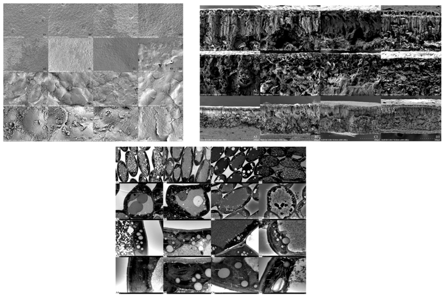 图5. 增强UV-B辐射对叶片气孔及叶表显微结构的影响(上左);对叶片叶肉细胞显微结构的影响(上右);