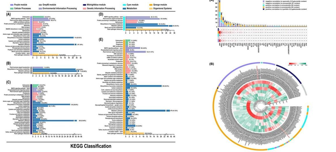 该团队前期研究表明,套袋处理可以抑制‘圣心’杧果果皮花青苷和黄酮醇积累,但促进原花青素积累。为了明确光照调控杧果果皮类黄酮积累的分子机制,选择生长健壮的‘圣心’杧果树为试验材料,在田间进行果实套袋处理,以自然光照射为对照(CK),进行了转录组测序。结果显示,WGCNA分析将所有基因按照表达模式分成33个模块,其中purple模块和黄酮醇含量呈显著负相关,grey60模块和原花青素含量呈显著负相关,cyan和orange模块和原花青素含量呈显著正相关,midnightblue模块和花青苷含量呈显著正相关(图2左);KEGG结果显示,候选基因主要富集到代谢通路(metabolic pathways)和次生代谢物质合成通路(biosynthesis of secondary metabolites)(图2右);WGCNA共鉴定到16个类黄酮合成结构基因、15个MYB转录因子和42个bHLH转录因子(图3左);WGCNA鉴定到的其它转录因子主要包括ERF、WRKY和bZIP,数量分别达到66、34和22个(图3右)。