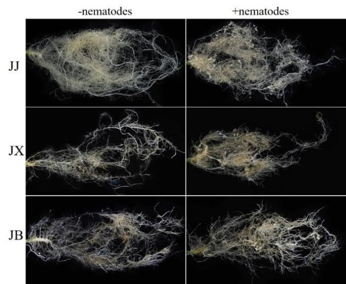图1. 根结线虫侵染前后嫁接苗的根部形态