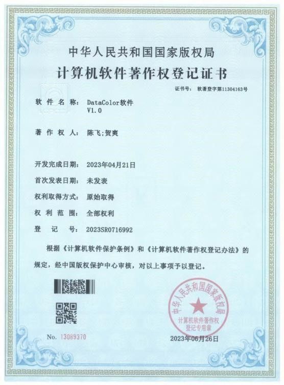 图6. “DataColor软件”计算机软件著作权登记证书