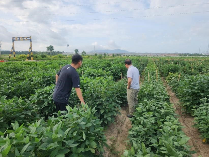 图12. 河南大学王学路团队张豹和朱丹华老师于热带大豆分子育种创新团队基地考察现场