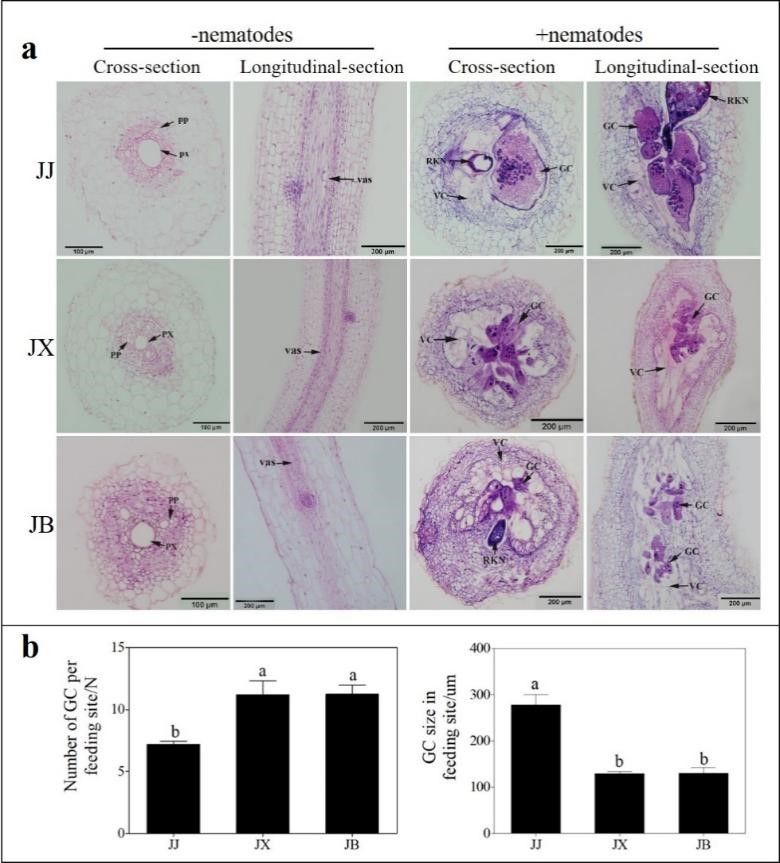 图2. 接穗-砧木组合根系线虫取食部位的组织病理学分析