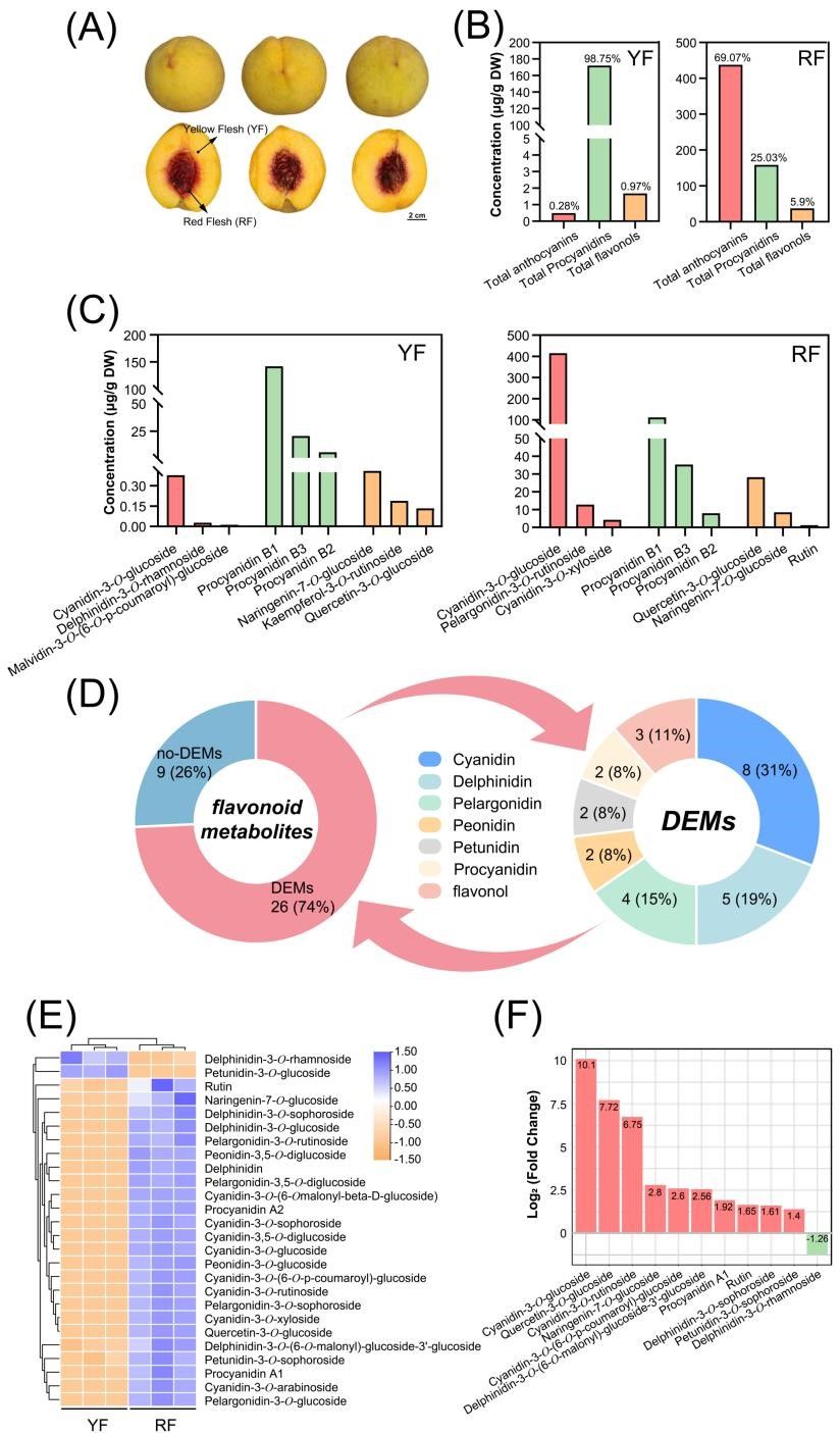 Note:(A) pigmentation pattern in the peel and flesh of ‘Jinxiu’ peach; (B) total anthocyanin, proanthocyanidin, and flavonol concentrations in the yellow flesh (YF) or red flesh (RF) of peach; (C) concentrations of predominant anthocyanin, proanthocyanidin, and flavonol compositions in the YF or RF of peach; (D) statistics of the expressed metabolites and differentially expressed metabolites; (E) heatmap of the 26 DEMs, and the color indicates the relative content of each DEM, ranging from yellow (low) to blue (high); and (F) summary of the DEMs with the most significant concentration fold change in the YF vs. RF.