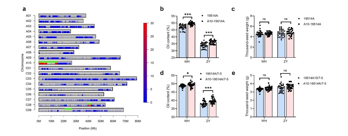 Note:a Background response analysis of A10–19514A. The lines on the chromosome represent the single nucleotide polymorphisms (SNPs) present between ZY50 and 19514 A, blue lines represent genotypes consistent with 19514 A, red lines represent genotypes consistent with ZY50, and green bars represent predicted import fragment regions. b Oil content (OC) of 19514 A and A10–19514A in Wuhan (WH) and Zhangye (ZY). c Thousandseed weight (TSW) of 19514 A and A10–19514A in WH and ZY. d OC of hybrids in WH and ZY. e TSW of hybrids in WH and ZY. Data comparisons in b–e were performed by one-way analysis of variance; ns, no signiffcant difference; *P < 0.05, * **P < 0.001.