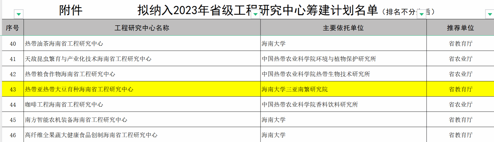 2023年9月28日,海南省发展和改革委员会发布关于拟列入2023年省级工程研究中心筹建计划名单,经综合研究,拟将热带亚热带大豆育种海南省工程研究中心列入2023年省级工程研究中心筹建计划。