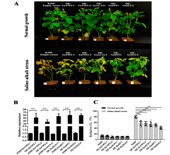 图3. Effects of overexpressing five tonoplast-associated DEPs of composite soybean plants under saline-alkaline resistance.