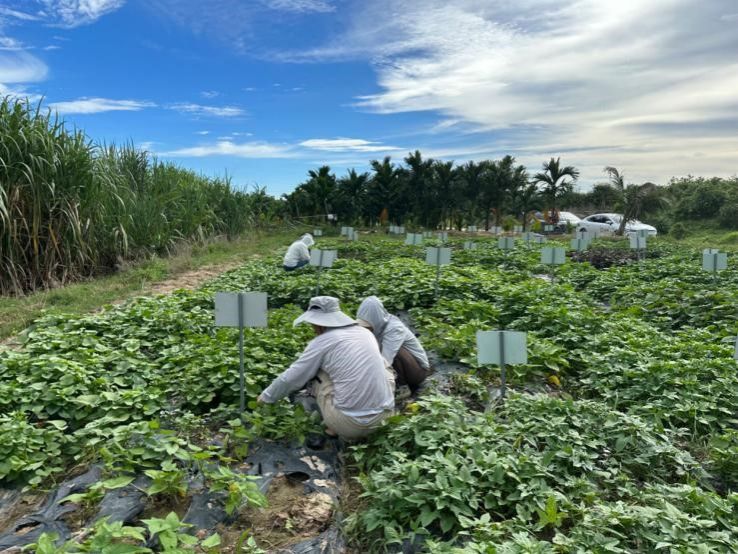 2023年9月18日,热带特色蔬菜产业技术创新与服务团队成员刘意带领14名研究生前往试验基地对参试的菜用甘薯新品系进行第二次产量测定。