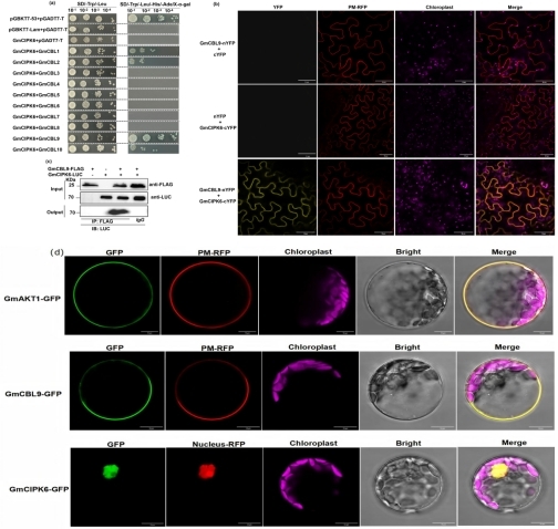 为了明确GmCIPK6是否受到上游钙离子(Ca2+)感受器GmCBLs的调控,研究人员首先通过Y2H实验证明了GmCIPK6与大豆中的GmCBL1、GmCBL2以及GmCBL9相互作用(图 3a)。进一步通过BiFC和Co-IP实验证了在植物体内GmCIPK6与GmCBL9存在相互作用关系(图 3b-c)。值得注意的是,研究者通过亚细胞定位分析发现,GmCBL9和GmAKT1定位在细胞膜上,GmCIPK6定位在细胞核上(图 3d)。而BiFC结果显示,GmCBL9与GmCIPK6以及GmCIPK6与GmAKT1相互作用后都定位在细胞膜上(图 2b,3b),通过以上结果,研究者推断GmCBL9与GmCIPK6相互作用后,GmCBL9可能将GmCIPK6从细胞核招募至细胞膜上,进而使GmCIPK6与定位在细胞膜上的GmAKT1发生相互作用。