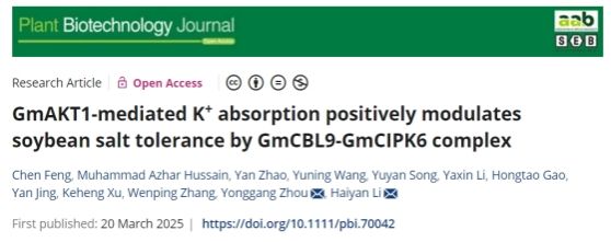 李海燕团队在Plant Biotechnology Journal杂志在线发表了”GmAKT1-mediated K+ absorption positively modulates soybean salt tolerance by GmCBL9-GmCIPK6 complex”的研究论文。该研究工作通过创制过表达和敲除大豆材料,鉴定到钾离子通道蛋白基因GmAKT1具有正向调控大豆耐盐性的作用。然后,对GmAKT1的上游调控网络进行解析,通过互作蛋白筛选,明确了大豆中存在GmAKT1与GmCIPK6以及GmCIPK6与GmCBL9的相互作用关系,以此构成一个“GmCBL9-GmCIPK6-GmAKT1”调控大豆耐盐性的分子模块。进一步,结合电生理体系以及多基因聚合大豆材料表型分析等,揭示GmCBL9-GmCIPK6复合体通过磷酸化并激活GmAKT1对K+的吸收,进而维持体内Na+/K+平衡,最终提高大豆耐盐性的分子机制。