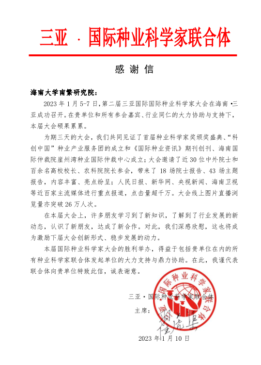 《三亚·国际种业科学家联合体致成人网 的一封感谢信》