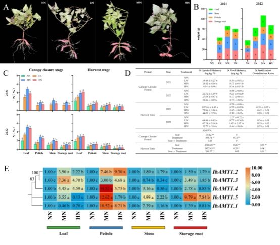 甘薯作为重要的粮食作物,其主要贮藏物质为淀粉。研究团队选用我国主栽且在海南主推的甘薯品种‘普薯32’进行盆栽试验,结果显示,相较于高产氮肥施用量,过量施氮显著抑制了甘薯幼根中淀粉的合成,导致块根数量减少,进而影响产量。为探寻关键基因,研究人员借助生物信息技术,鉴定了淀粉合成关键酶基因IbSUSs和IbAGPases的家族成员。通过RT-qPCR技术检测氮处理下这些基因的表达量,并结合农艺性状进行相关性分析,初步判定IbAGPL3是响应高氮胁迫、抑制淀粉合成、致使块根数量减少的关键基因。