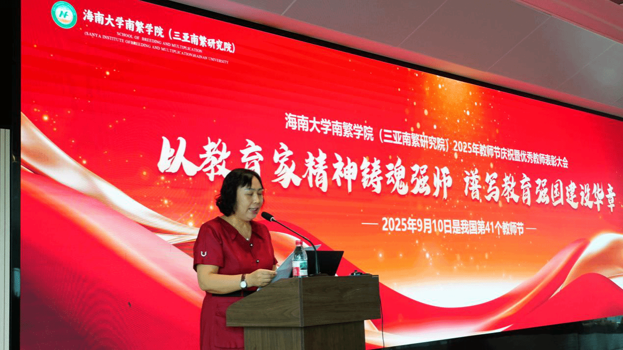 在南繁众创中心317报告厅隆重召开2025年教师节庆祝暨优秀教师表彰大会。院党委书记黄东益,院长李海燕,副院长杨小锋、吴友根、陈艳丽、夏志强、徐冉,获奖教职工代表、各入驻团队代表,院各办、中心代表,新入职教师代表,学生代表参加大会。会议由副院长杨小锋主持。