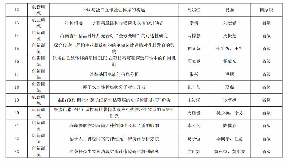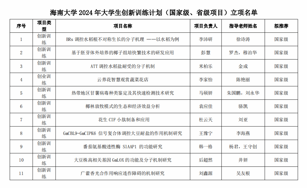 举办了2024年“大学生创新创业训练计划”项目,经个人申报、教务处审核、实验教学中心组织专家评审,南繁学院师生的参赛作品在学校众多队伍中脱颖而出,7月12日我院共有23项项目立项,国家级项目共计12项,省级项目共计11项。