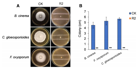 图1 菌株R2对采后真菌病原菌的体外拮抗活性