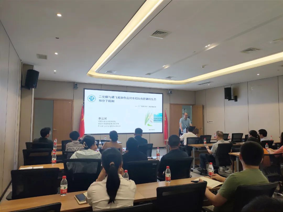 李云河教授的报告集科学性、故事性和趣味性于一体,围绕“稻飞虱为什么偏爱从抗螟虫转基因稻田向非转基因稻田扩散转移?”“褐飞虱为什么偏爱在二化螟为害过的稻株上取食和产卵?”“共享寄主的褐飞虱和二化螟种间为什么能共存而非竞争?”等科学问题,深入研究了水稻介导的褐飞虱、二化螟及其卵寄生蜂的多重种间关系及机制。揭示了共享寄主的二化螟和褐飞虱协同调控水稻防御,实现兼性“互惠共存”种间关系的生化和分子机制,并基于“生态位理论”,阐明了共享食物资源的昆虫种间实现互利关系的生态学机理。研究结果颠覆了共享寄主昆虫种间普遍存在“竞争排斥”关系的传统认知,拓展和深化了“生态位分异理论”,同时为发展稻田害虫绿色防控技术提供了重要科学依据。