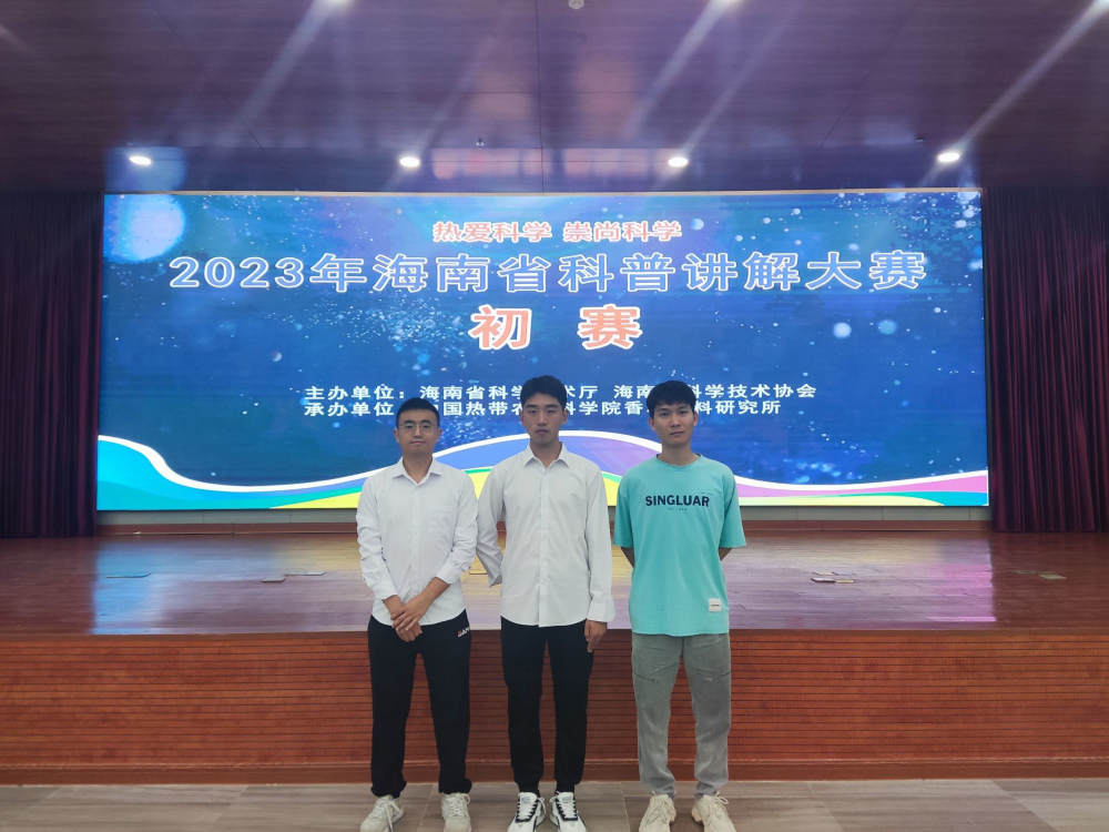 我院代表鲍次次、李鹏、王建波经过院内初赛选拔,代表崖州书院参加2023年海南省科普讲解大赛初赛。这次比赛不仅考验了选手们的知识和技能,也提升了选手们的毅力和决心。希望选手们能从这次经历中学到宝贵的经验,并在未来的科学研究和科普工作中取得更大的提升,也希望广大青年学子积极服务社会,参与科普活动,为海南自贸港建设贡献自身力量。
